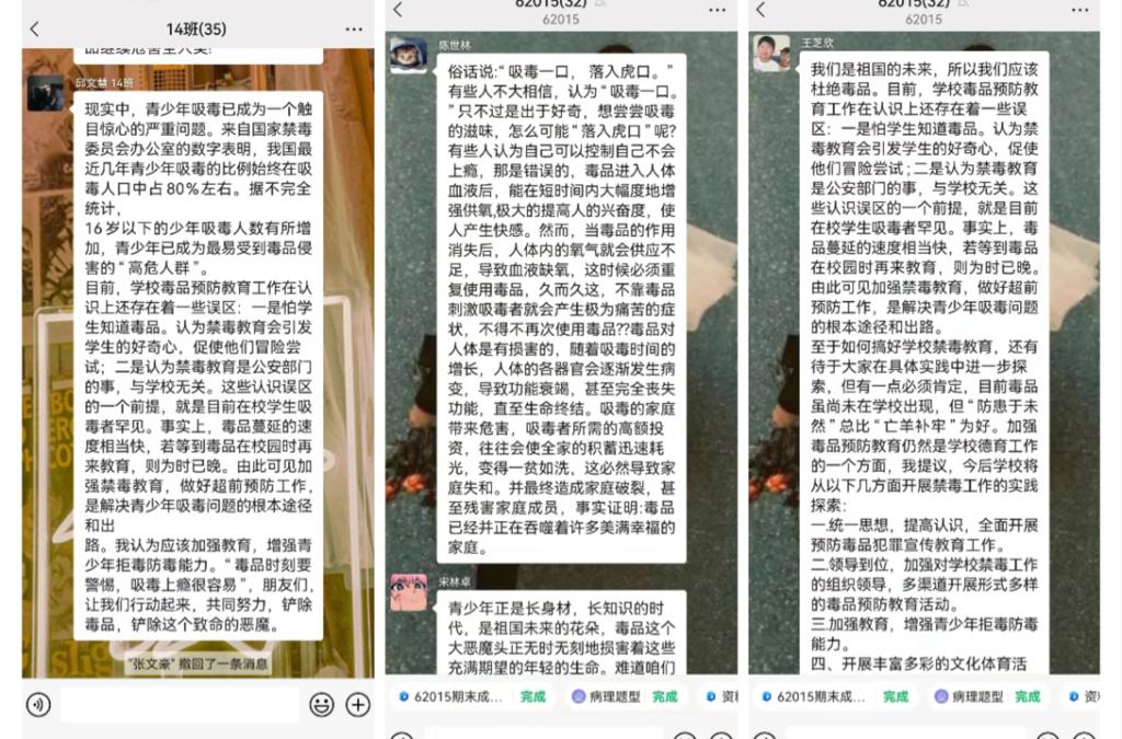 毒品是人類的公害。在中國近代史上,毒品曾給中華民族帶來深重的災(zāi)難。它不僅危害人民群眾,特別是廣大青年的身心健康,而且嚴(yán)重威脅著社會穩(wěn)定,影響經(jīng)濟發(fā)展和社會進(jìn)步。為了提高同學(xué)們抵御新型毒品的能力,提升識毒、防毒、拒毒意識,護理學(xué)系62011–20班于6月3日晚九點在釘釘平臺上開展了“美麗青春,無毒人生”毒品預(yù)防主題班會。此次班會由62011班團支部書記劉佳莉同學(xué)主持,輔導(dǎo)員趙艷老師及全體同學(xué)參會。