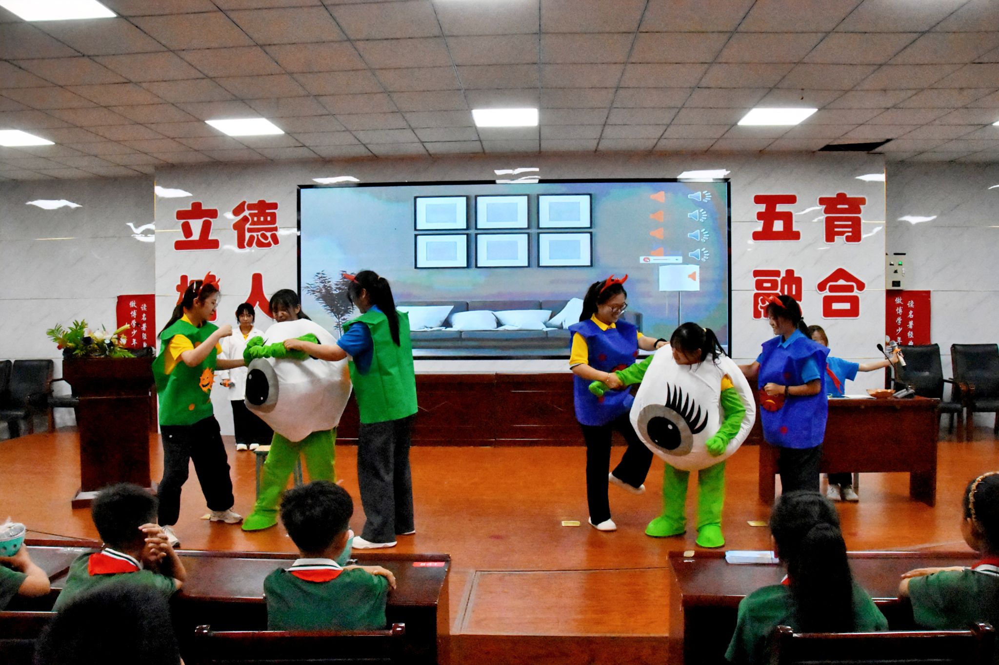 活動中,我校眼視光學(xué)系的同學(xué)們發(fā)揮專業(yè)所長,把愛眼護眼知識融入趣味情景劇《我的視力我做主》《神奇的用眼指南》中,將專業(yè)智慧轉(zhuǎn)化為生動教育,讓小朋友們直觀感受到了視力健康的重要性;手勢舞《光明的未來》,把抽象的愛眼理念轉(zhuǎn)化為小朋友們可感可知的鮮活故事與律動節(jié)奏;在“愛眼護眼小妙招”環(huán)節(jié)中,大學(xué)生們化身親切的“小老師”,手把手帶領(lǐng)小朋友們學(xué)習(xí)眼保健操,細(xì)致講解讀寫姿勢、科學(xué)用眼時間管理及健康營養(yǎng)搭配等實用知識,讓愛眼護眼行動精準(zhǔn)落地。