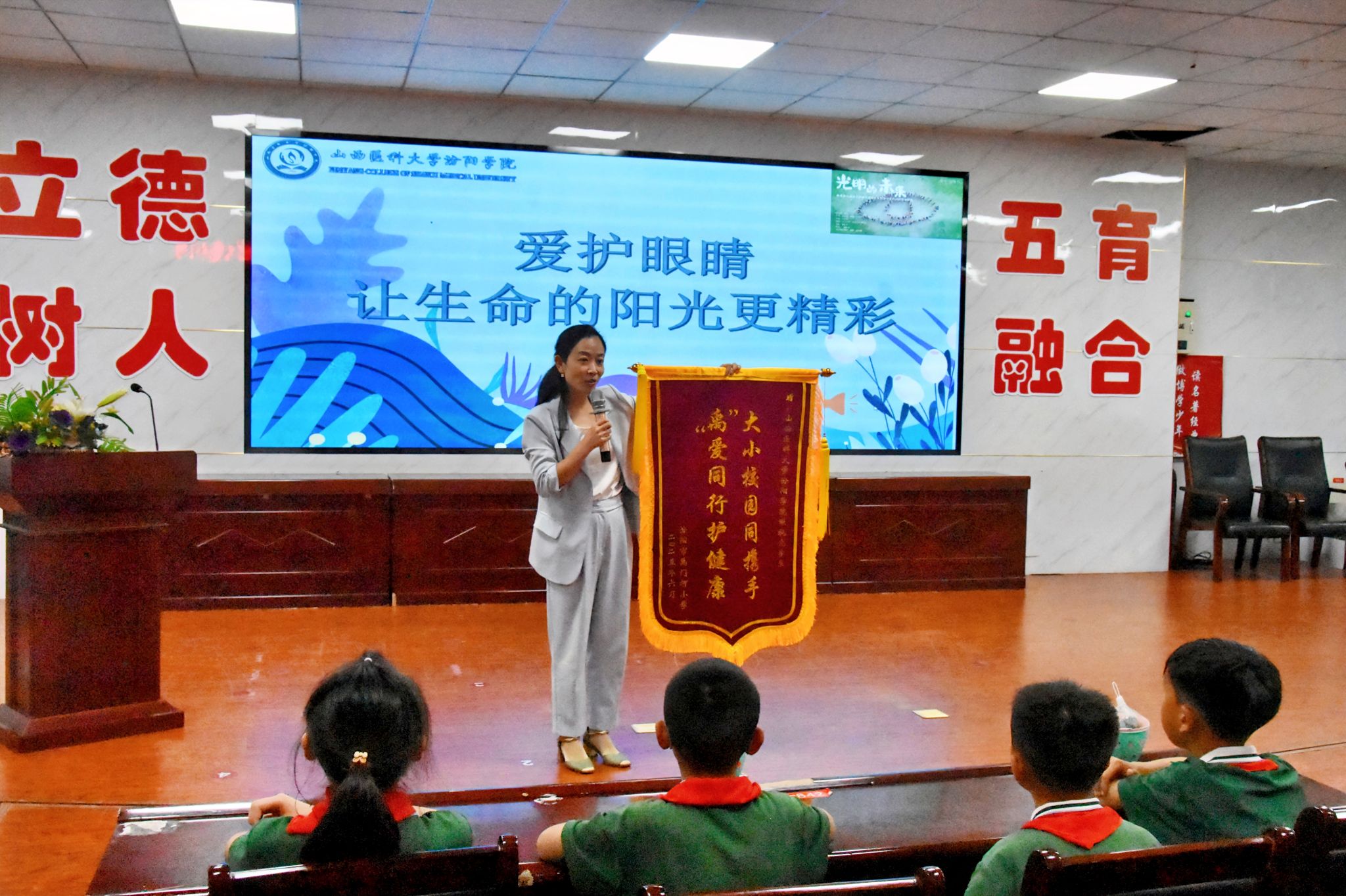 活動后,禹門河小學(xué)為眼視光學(xué)系贈送了錦旗,感謝我校師生為小學(xué)生眼健康的用心付出。